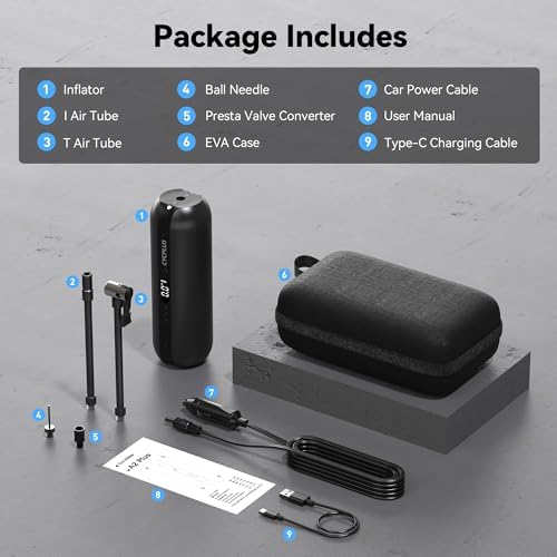 • Vielseitige Aufsätze: Ausgerüstet mit Schrader- und Presta-Ventilaufsätzen sowie einem Nadeladapter für verschiedene Anwendungen.