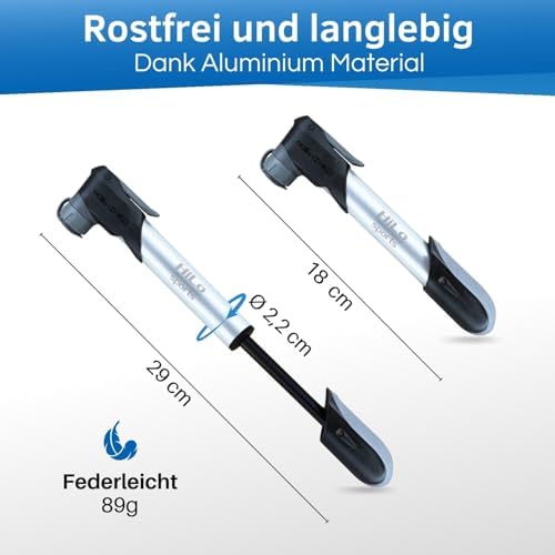 Mit einer kompakten Länge von nur 18 cm und einem Gewicht von nur 80 g ist diese Mini Pumpe der perfekte Begleiter. Sie findet problemlos Platz in deinem Rucksack oder in deinem Trikot und ist immer bereit, dir bei Bedarf zur Seite zu stehen. Du wirst nie wieder sorgen müssen, dass die Pumpe zu schwer oder sperrig ist!