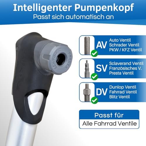 Der innovative Pumpenkopf unserer Mini Pumpe ist ein Highlight, das sich automatisch zwischen den gebräuchlichsten Ventilarten – AV (Autoventil) und SV (Sclaverandventil) – umschaltet. Für DV-Ventile (Dunlopventile) senden wir einen praktischen Adapter mit. So bist du bestens ausgerüstet, egal welches Ventil dein Fahrrad hat.